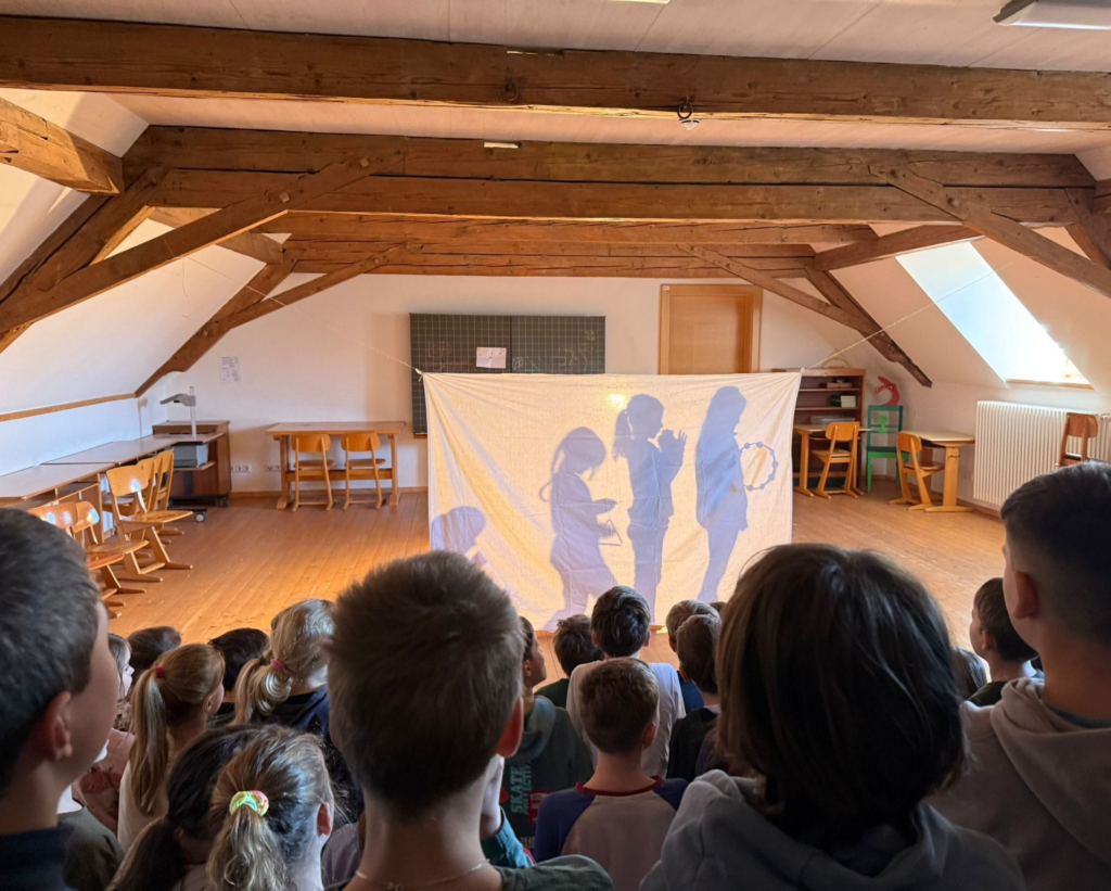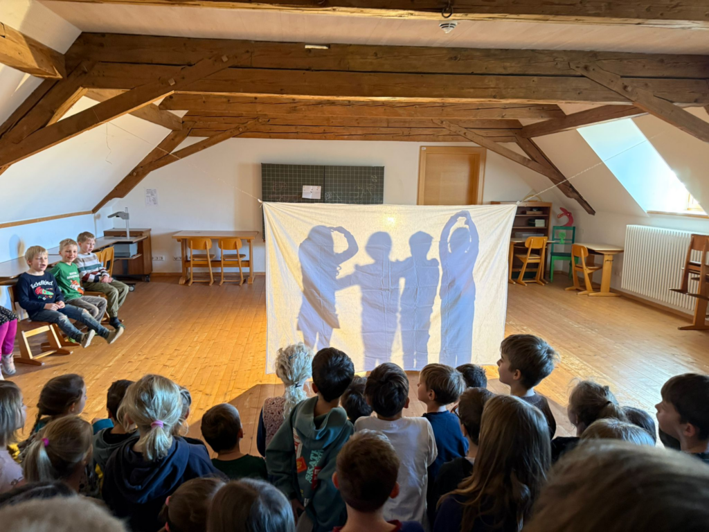 Am 13. März präsentierte die erste Klasse ein Schattentheater zum Lied „Die Vogelhochzeit“. Mit Begeisterung studierten die Kinder vier Strophen ein, die sie nicht nur sangen, sondern auch szenisch umsetzten. Die Aufführung fand vor den anderen Klassen statt und bot einen Einblick in die kreative Arbeit der Kinder.